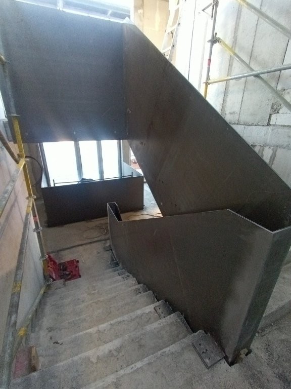 Spindeltreppen, Geländer, Glasfassaden, Treppen und Stahlbau für ein Wohn- und Geschäftsgebäude mit Einkaufsmeile und Tiefgarage. München 2022
